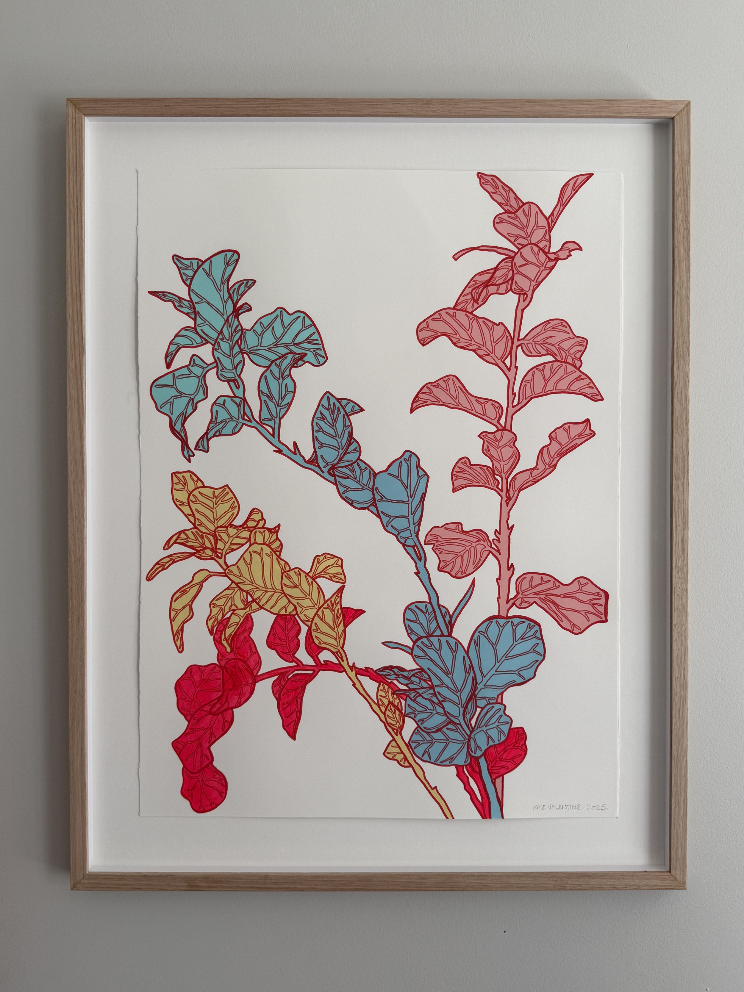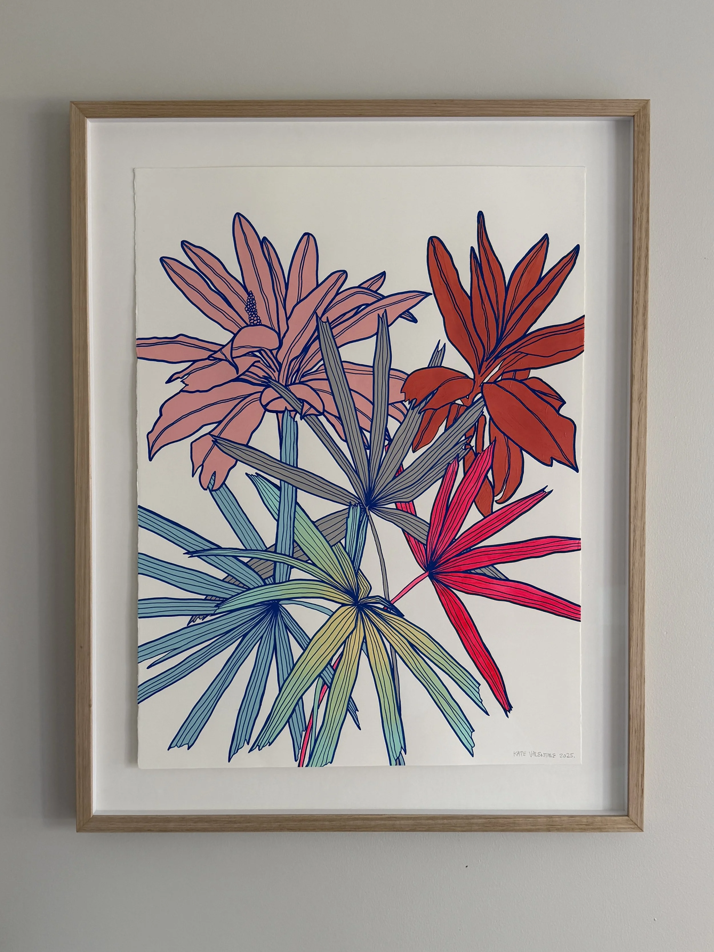 Drawing on her training in printmaking, Valentine stretches botanical forms and flattens pictorial space to bring detail forward to the picture plane. Influenced by Japanese printmaking and painting, Manga, and 1990s–2000s Neopop, her work balances precision and exuberance, inviting sustained, close looking.